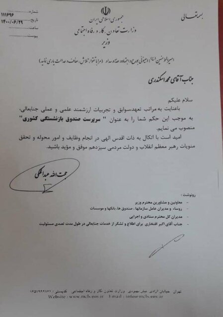 به گزارش ایسنا، همچنین محمد اسکندری، طی حکمی از سوی وزیر تعاون، کار و رفاه اجتماعی به عنوان سرپرست صندوق بازنشستگی کشوری منصوب شد.