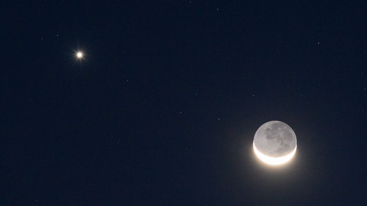 زهره آنقدر درخشان است که حتی در آسمان روز نیز مشاهدهشدنی است. این عکس، لحظه نادری را ثبت کرده که هلال ماه (در مرکز) و سیاره زهره (بهعنوان یک نقطه درخشان در موقعیت حدوداً ساعت ۱۰ روی صفحه ساعت فرضی دور ماه) همزمان در آسمان روز میدرخشند.