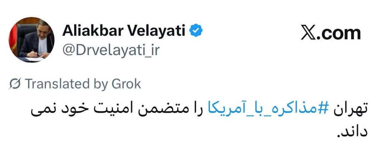 علیاکبر ولایتی، مشاور رهبری در شبکه اجتماعی ایکس نوشت: تهران مذاکره با آمریکا را متضمن امنیت خود نمیداند.