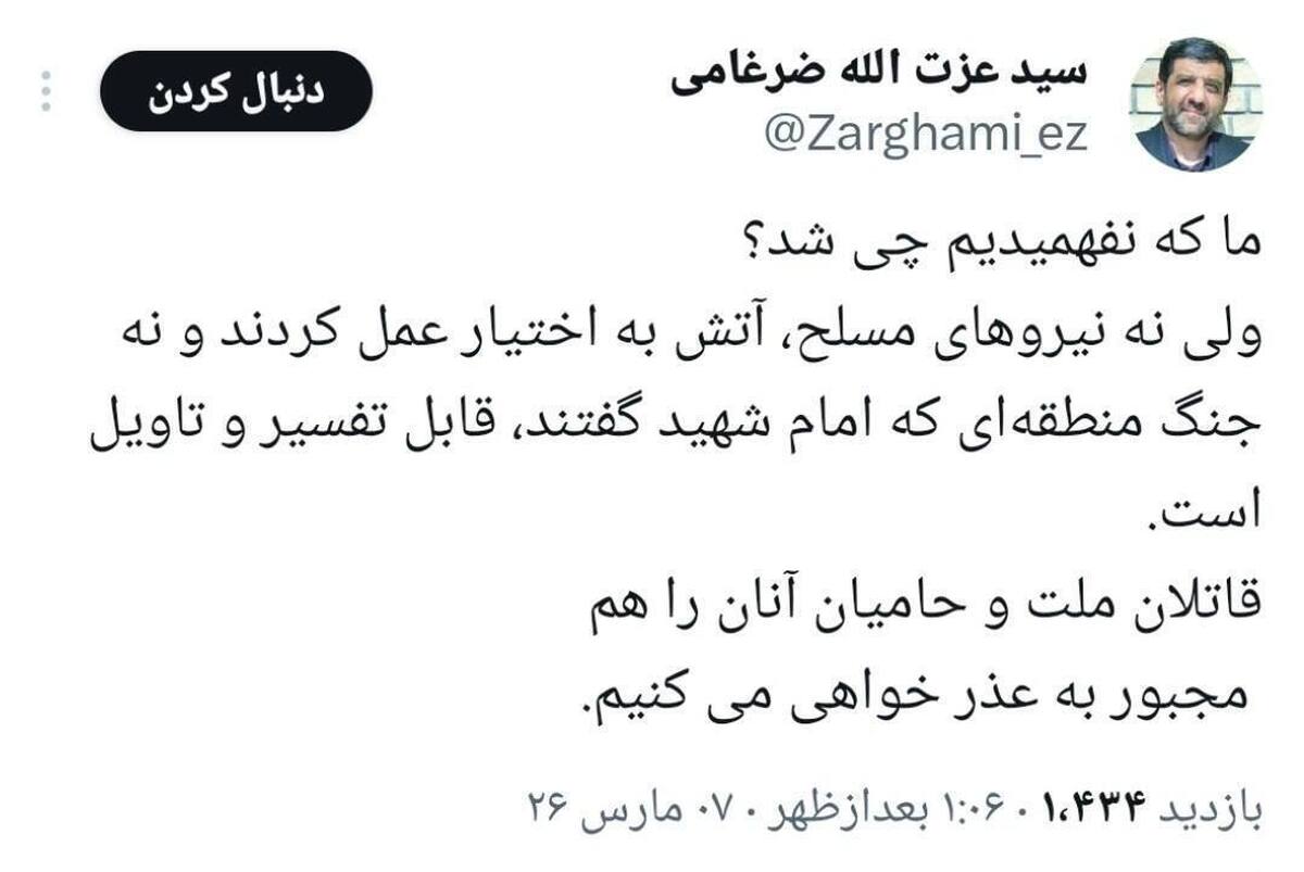 ضرغامی نوشت: قاتلان ملت و حامیان آنان را هم مجبور به عذر خواهی می کنیم.