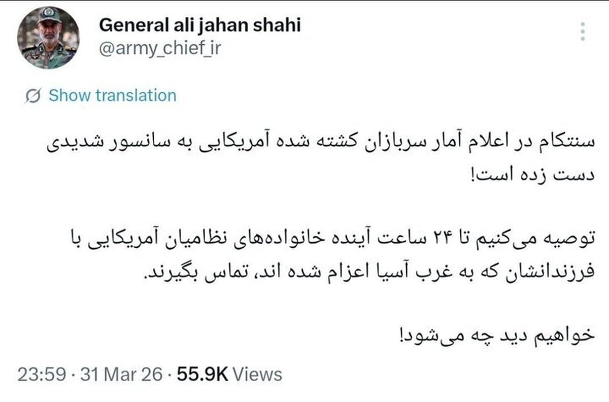 توصیه می‌کنیم تا ۲۴ ساعت آینده خانواده‌های نظامیان آمریکایی با فرزندان‌شان که به غرب آسیا اعزام شده‌اند، تماس بگیرند.