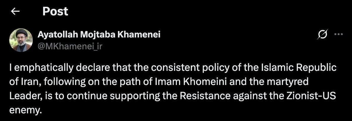 آیت الله سید مجتبی خامنهای، رهبر انقلاب در شبکه اجتماعی ایکس و به زبان انگلیسی نوشت: «قاطعانه اعلام میکنم که سیاست منسجم جمهوری اسلامی ایران در پیروی از راه امام خمینی (ره) و رهبری شهید، تداوم حمایت از مقاومت در برابر دشمن صهیونیستی - آمریکایی است.»