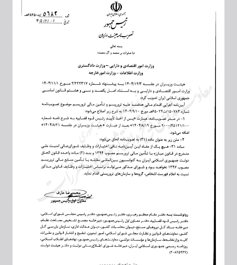 هیئت وزیران به شورای عالی امنیت ملی اختیار داد بر اساس وظایف قانونی نسبت به اعلام فهرست اشخاص، گروهها و سازمانهای تروریستی اقدام کند.