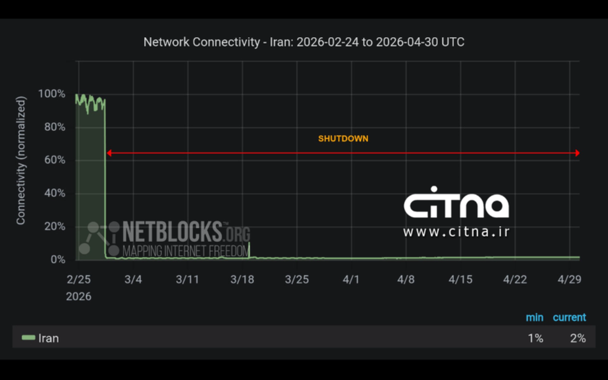 به گزارش سیتنا، بر اساس تازهترین گزارش نتبلاکس، قطعی اینترنت در ایران اکنون پس از گذشت ۱۴۶۴ ساعت، وارد شصتودومین روز متوالی خود شده است. این نهاد میگوید بخش گستردهای از مردم عملاً از ارتباط با جهان خارج محروم ماندهاند.
