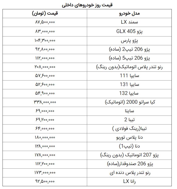 پژو ۴۰۵ جی ال ایکس ۸۳ میلیون تومان، پژو ۲۰۶ تیپ ۵ (ساده) ۱۱۲ میلیون تومان، ساینا ۶۹ میلیون تومان، تیبا ۲ حدود ۶۹ میلیون و ۲۰۰ هزار تومان، تیبا (رینگ فولادی) ۶۴ میلیون تومان، پژو ۲۰۷ اتوماتیک (بدون رینگ) ۱۷۸ میلیون تومان و پژو ۲۰۶ صندوقدار (ساده) ۱۱۲ میلیون و ۲۰۰ هزار تومان با افزایش متوسط ۲ میلیون و ۲۰۰ هزار تومانی در قیمت معامله شدند.