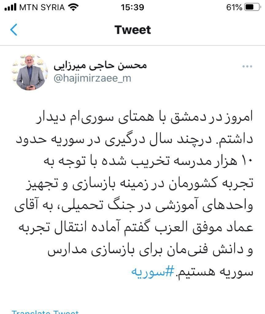 محسن حاجی میرزایی در بدو ورود به فرودگاه دمشق در جمع خبرنگاران از آمادگی ایران برای انتقال تجربه در بازسازی واحدهای آموزشی سوریه خبر داد.