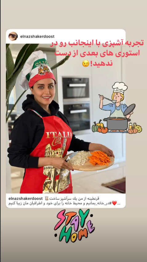 الناز شاکردوست بازیگر فیلم «شبی که ماه کامل شد» در اینستاگرام تصویری از خودش منتشر کرد که مشغول آشپزی است. او با تشویق مردم به در خانه ماندن نوشت: «قرنطینه از من یک سرآشپز ساخت.»