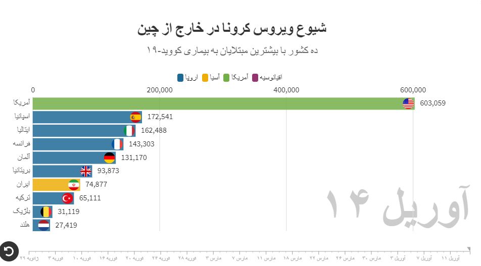 براساس آخرین آمارهای منتشر شده از سوی دولتها و سازمانهای بینالمللی، تا شامگاه سهشنبه ۱۴ آوریل (۲۶ فروردین) شمار مبتلایان به ویروس کرونا در سراسر جهان به مرز ۲ میلیون نفر رسیده است. بیماری کووید-۱۹ تا کنون جان بیش از ۱۲۵ هزار نفر را گرفته است.