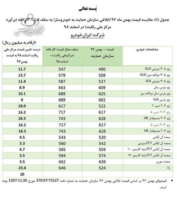 خبرگزاری فارس هفته پیش فهرست قیمت های تعیین شده توسط شورای رقابت برای محصولات ایران خودرو و سایپا را منتشر کرده بود و حالا قیمت نهایی خودروها مطابق با قیمت های اعلام شده از سوی شورای رقابت به خودروسازان ابلاغ شده است.