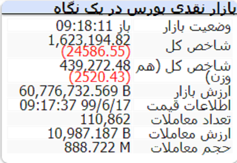 شاخص کل بازار متاثر از صف‌های فروش فارس، فملی، وغدیر و کگل چیزی حدود 1.3 درصد ریزش کرده است و بیشترین عرضه در نمادهای خودرویی و شستا دیده می‌شود و بیشترین تقاضا در عرضه اولیه‌های بپیوند و ثپهساز است. همچنین فلزات اساسی، بانک‌ها و محصولات شیمیایی بیشترین حجم و ارزش معاملات را به خود اختصاص داده‌اند.