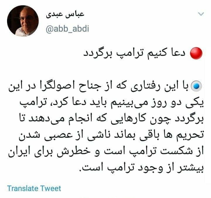 عباس عبدی، فعال سیاسی اصلاح طلب در واکنش به طرح مجلس برای خروج ایران از برجام، نوشت: با این رفتاری که از جناح اصولگرا در این یکی دو روز میبینیم باید دعا کرد، ترامپ برگردد چون کارهایی که انجام میدهند تا تحریم ها باقی بماند ناشی از عصبی شدن از شکست ترامپ است و خطرش برای ایران بیشتر از وجود ترامپ است.