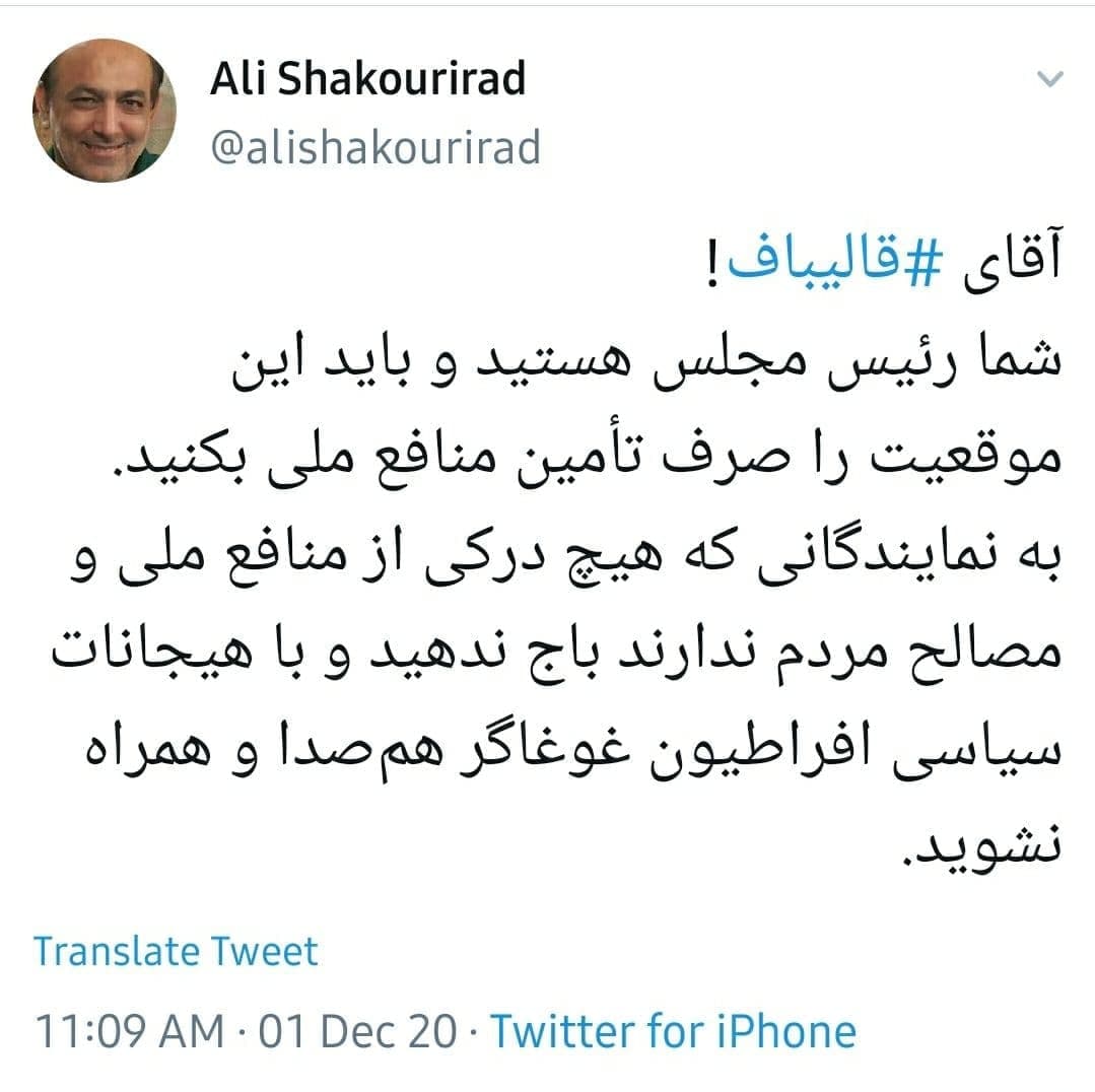 دبيركل حزب اتحاد ملت نیز در توئیتی نوشت: آقاى قاليباف شما رييس مجلس هستيد؛ با هیجانات سیاسی افراطیون غوغاگر همصدا و همراه نشوید.